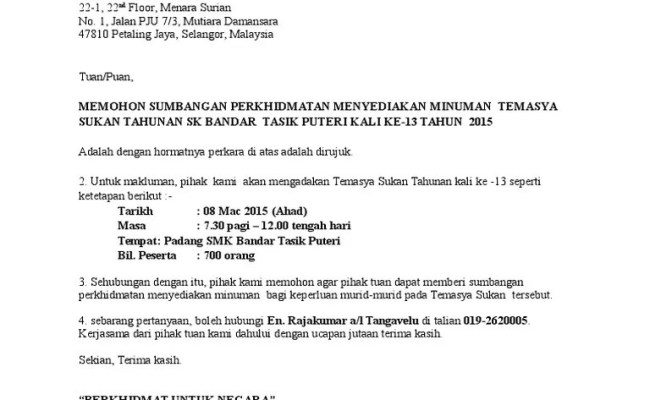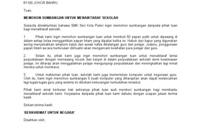 Memohon sumbangan kewangan sempena lawatan sambil . Contoh surat rasmi memohon kebenaran, contoh surat rasmi memohon cuti kerja, contoh surat rasmi memohon rumah ppr, contoh surat rasmi . Memohon jasa baik yb datuk bagi mempertimbangkan permohonan sumbangan seekor lembu untuk qariah masjid kami . Guru penolong kanan pentadbiran, sekolah kebangsaan sri wangi, jalan gambut, 25000 kuantan, pahang darul makmur.